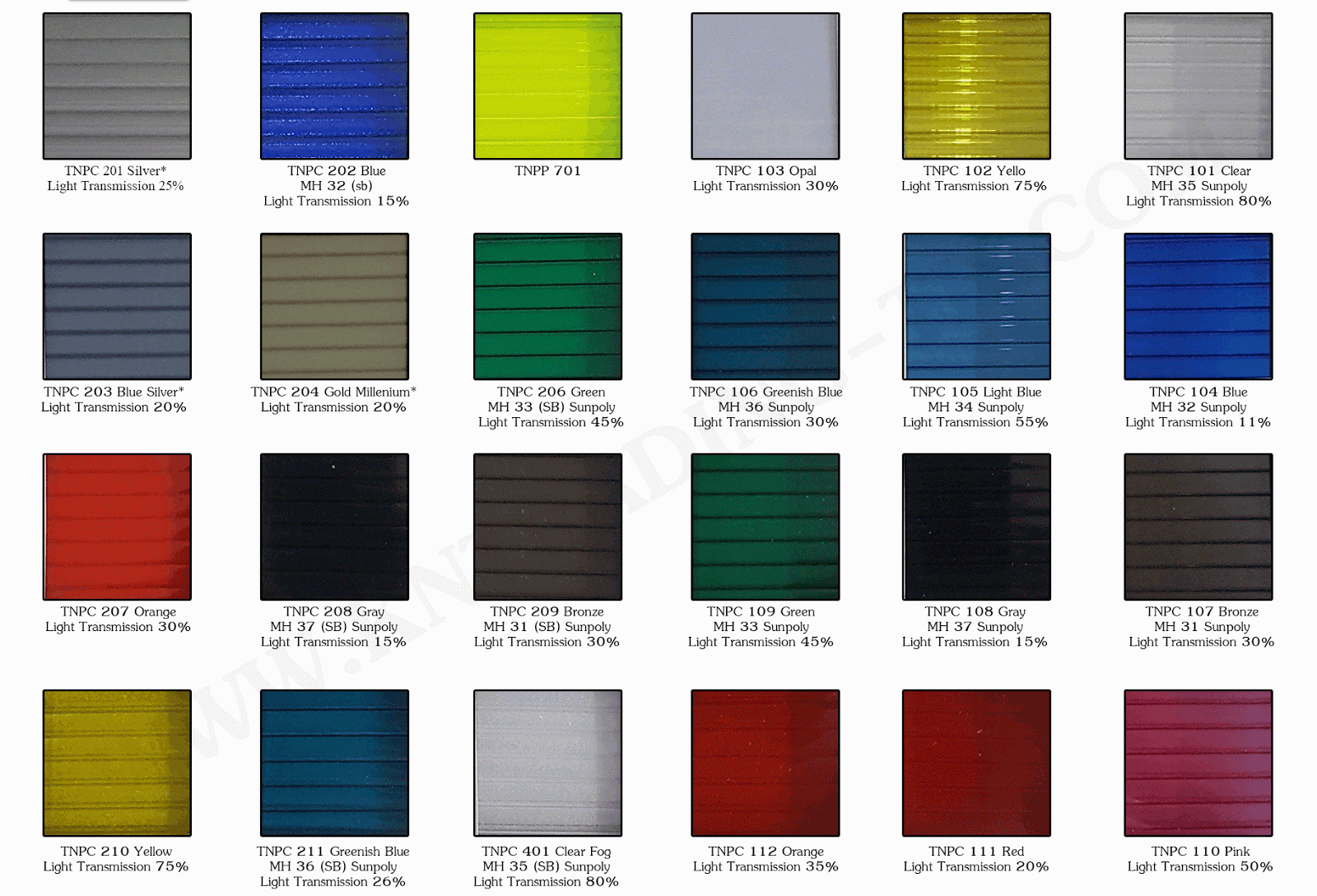 จำหน่ายวัสดุหลังคาโพลีคาร์บอเนตหรือหลังคาโปร่งแสง (Polycarboante) สำหรับงานติดตั้งหลังคากันสาดที่ต้องการแสงสว่างจากธรรมชาติ ความสวยงาม ทันสมัย ทั้งยังป้องกันรังสียูวี (อัลตราไวโอเลต) ได้เกือบ 100 เปอร์เซ็น โดยหลังคาโพลีคาร์บอเนตหรือที่เราเรียกกันว่าหลังคาโปร่งแสง นั้น มีให้เลือกหลายแบบ ทั้งแบบ แผ่นลูกฟูก แผ่นตัน แผ่นลอน ซึ่งในแต่ละแบบจะมีขนาดและสีสันมากมายให้เลือกใช้ ทั้งนี้เรายังเป็นตัวแทนจำหน่ายแผ่น หลังคาไวนิล อลูมิเนียมลายไม้ อลูมิเนียมคอมโพสิต และอุปกรณ์ติดตั้งงานโพลีคาร์บอเนต พร้อมทั้งยินดีให้คำปรึกษาและบริการจัดส่ง ฟรี ในเขตพื้นที่ กทม. และ ปริมณฑล